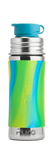 100% plastic free sport bottle easily transitions to infant, sippy, straw bottle, or snack container with medical-grade silicone components from Pura^Includes leak-proof big mouth sport top and bright-colored swirl sleeve crafted of medical grade silicone; top not for hot beverages^Food grade #304 (18/8) stainless steel and medical grade silicone contains no BPA, bps, ea., PVC, phthalates, or other toxins and no internal lining^Colorful swirl silicone sleeve provides additional grip; bottle features internal volume marks for easy measuring^Dishwasher safe; compatible with other Pura silicone components and accessories