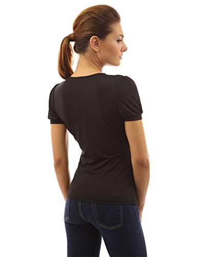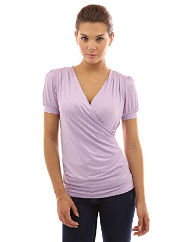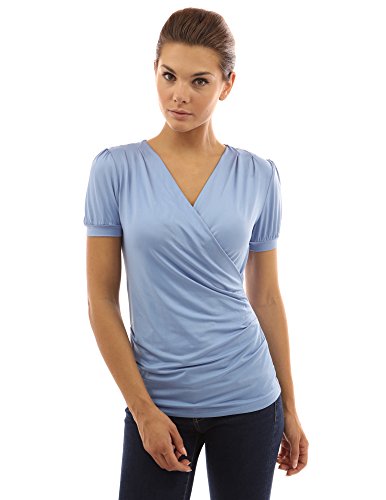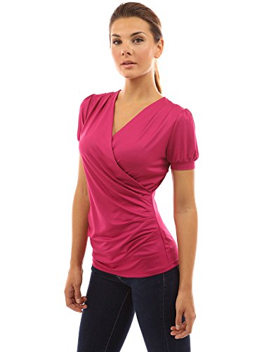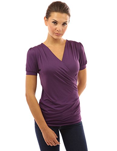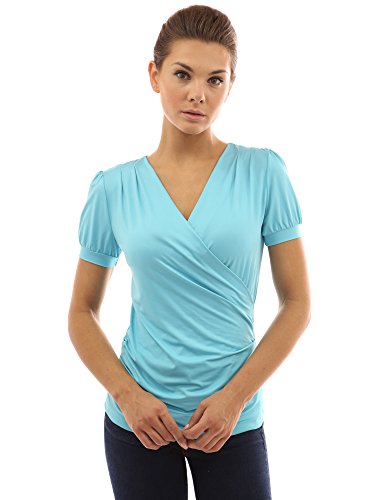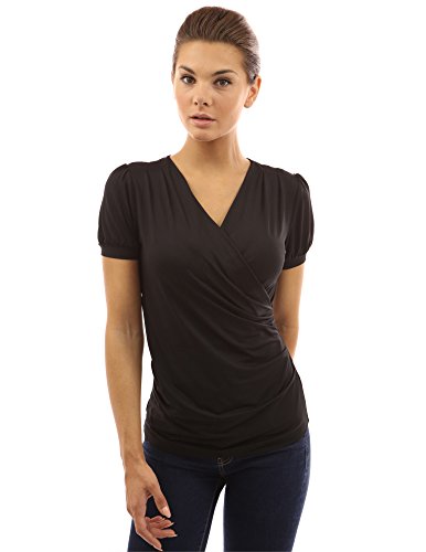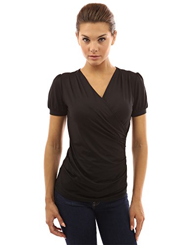Puffed Short Sleeve V Neck Crossover Faux Wrap Pleated Blouse Top. Model in pictures is 5 feet 8 inches (173cm) tall.