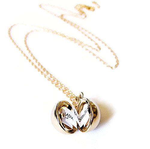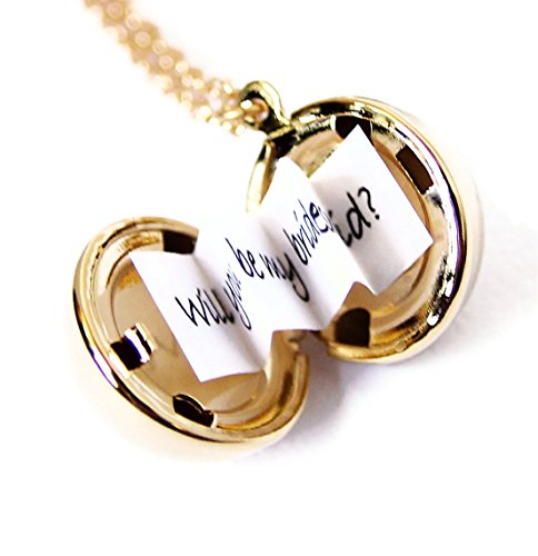 This darling gold-tone secret message ball locket necklace is the perfect way to show your love to that special someone in your life! It makes a great gift for a graduate, daughter, best friend, co-worker, family member, wife, sister, grandma, or a sweet gift for all of your bridesmaids! This style features a bright shiny gold plating over a raw brass locket. The shiny gold plating adds durability and shine and gives it a finished polished look! It also prevents tarnishing so your ball locket will always be shiny and looking just as new for years! You can create and write your very own personalized custom message inside the locket! This charming gold-tone locket necklace is fashioned with a classic and elegant round brass ball locket which opens on the right side to reveal 2 spaces on the inside. Inside the locket lays a strip of blank folded accordion-style paper so you can write your own personalized message, a secret note or a wish. Here are some fun message ideas: "Hooray, you did it!" "You had me at hello" "You're the peanut to my butter" "I love you to the moon and back" "You're the bumble to my bee" "Will you be my bridesmaid?" "You're the flip to my flop" "I love you" -your birthday, wedding or anniversary date "You + Me = Love" "Best friends forever" "It's always been you" The delicate gold plated brass cable chain is a generous 28 inches long, making it easy to slip on and off. The necklace is finished with a lobster clasp closure for extra security and the ball locket measures 18mm (about 3/4 of an inch). Have lots of friends or family members to shop for? Grab some of these ball lockets and still stay on your budget! These secret message lockets are the perfect gift for brides to give their bridesmaids and surprise them with a meaningful personalized message in each one.Feature