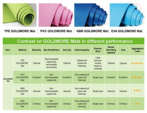Studio : Goldmore Publisher : Goldmore Binding : Misc. Product Description MAKE YOURSELF FEEL SPECIAL BY GIVING YOURSELF A YOGA MAT WITH GOOD QUALITY Goldmore Yoga mats with better cushion, high elasticity and resilience are great for hot Yoga, Bikram Yoga, Pilates, meditation, and other exercise routines. Our Yoga mat does not only give safety and stability, it will help you to remain focused and comfortable during your practice. Goldmore Yoga mats are available in different color ways. Goldmore mat is of unique pattern for anti-skid surface and sticky high-performance grip, provides support between the body and the floor and serves as a cushioning material for elbows, hips, and knees. ECO FRIENDLY, DURABLE, ANTI SLIP FULLY REVERSABLE YOGA MAT Made from environmentally friendly TPE, Intertek and SGS Certified non-toxic materials, durable and anti-slip yoga mat. Intense Yoga types such as Bikram, Ashtanga, Yin Yoga and Meditation. STORAGE CARE: STORAGE - TPE Yoga mat should be rolled up and kept in dry area when not being used. WASH - Clean your eco-friendly mat once a week or whenever necessary. Do not use a washing machine or dryer, air-dry only.