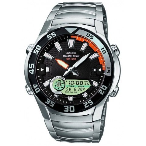 -. Feature : Case / bezel material: Stainless steel / Aluminum, Stainless Steel Band, One-touch 3-fold Buckle, 100-meter water resistance, Mineral Glass / LED light, Dual time, Moon data (moon age of the input data, moon phase graph), Tide graph (tide level for specific date and time) / 1/100-second stopwatch, Countdown timer, Multi-function alarms, Hourly time signal / Full auto-calendar (to year 2099), 12/24-hour format, Button operation tone on/off, Regular timekeeping / Accuracy: ±30 seconds per month, Approx. battery life: 10 years on CR2025, Size of case/total weight: 48 X 45.5 X 13.4 mm/149 g, LED:Umber