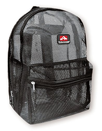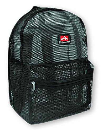 This Trailmaker mesh backpack measures 17" x 13" x 6" and is made out of high quality polyester mesh. It features padded adjustable straps, double zippered main section. Dual Zippered Compartments and a double zippered front pocket. Padded Adjustable Straps. Color: Black.