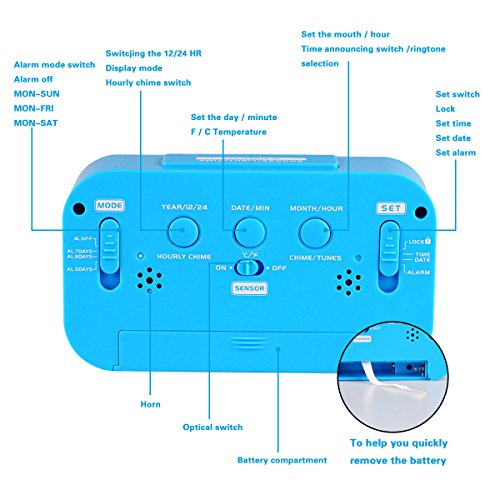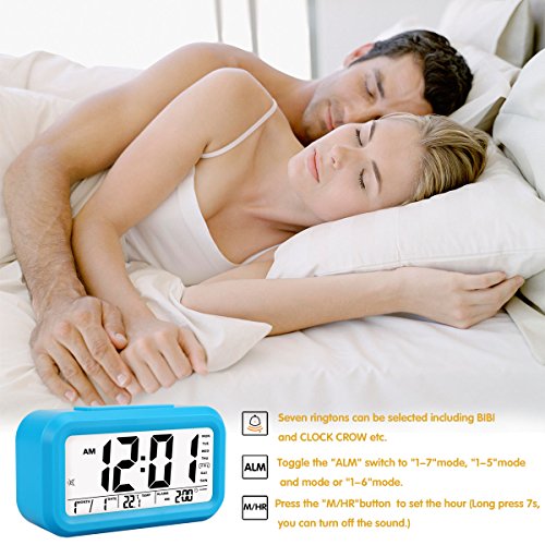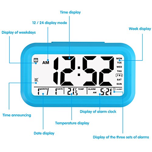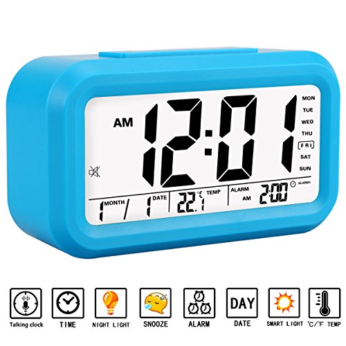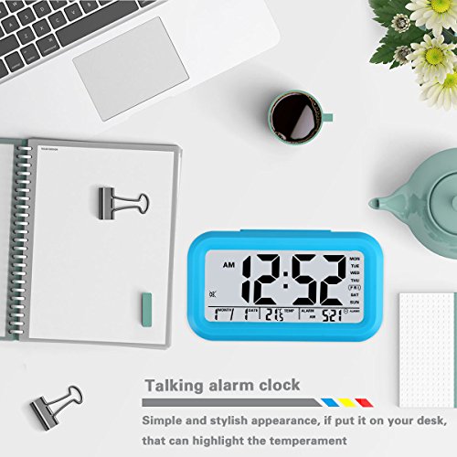 Alarm Clock, Aitey Talking Alarm Clock with Large Digital Display, Optional Weekday Alarm, Snooze, 3 Alarms, 7 Rings and Low Light Sensor Technology (Blue)