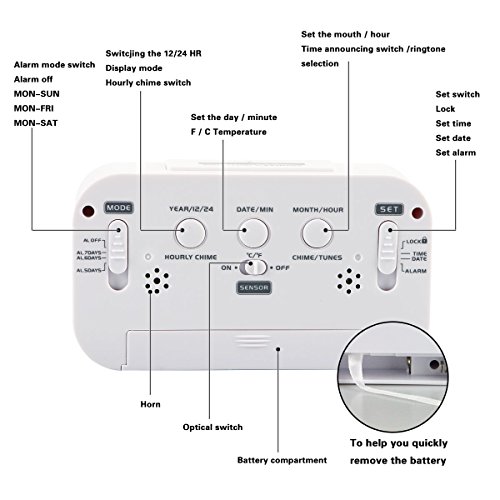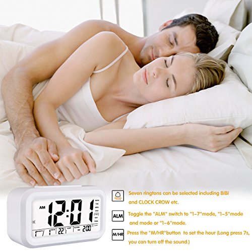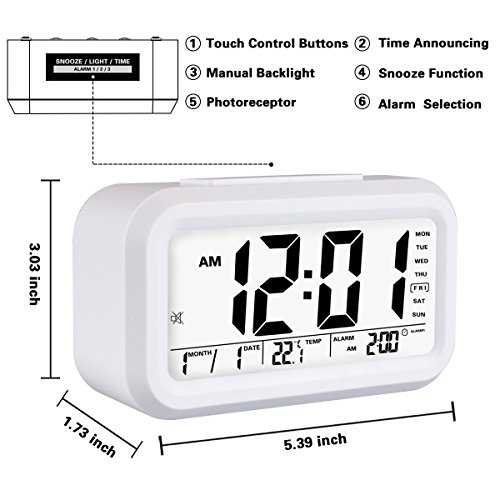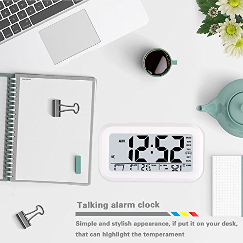 Alarm Clock, Aitey Talking Alarm Clock with Large Digital Display, Optional Weekday Alarm, Snooze, 3 Alarms, 7 Rings and Low Light Sensor Technology (White)
