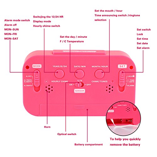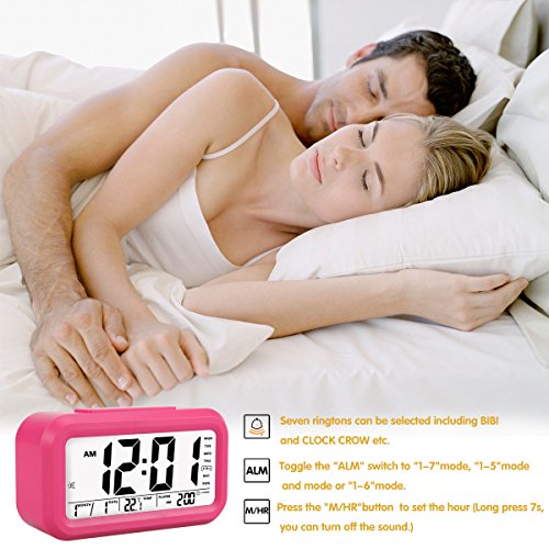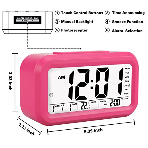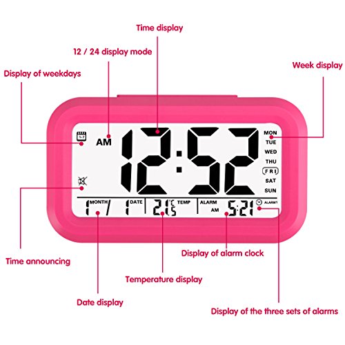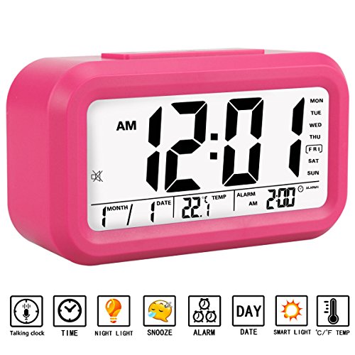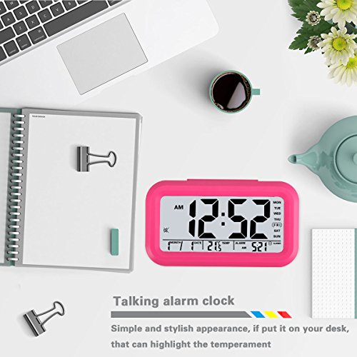 Alarm Clock, Aitey Talking Alarm Clock with Large Digital Display, Optional Weekday Alarm, Snooze, 3 Alarms, 7 Rings and Low Light Sensor Technology (Red)