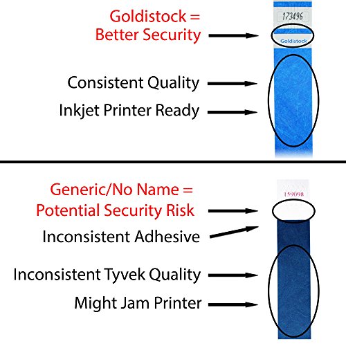 -. Feature : TRUSTED SUPPLIER - Event organizers trust the Goldistock brand. Our wristbands have been used in tens of thousands of events all across the USA and the world. / THE "BETTER SECURITY" WRISTBAND - (SEE IMAGE #2) The "Goldistock" name P.R.Inted on the wristband helps protect you from gatecrashers. / 100% MANUFACTURED IN USA - All material for our wristbands are made in the USA. All manufacturing is in the USA. A single sheet of Goldistock Original Series Wristbands contains 10 wristbands. You get 10 sheets for a total of 100 wristbands. / CONSISTENT QUALITY - We stand behind our wristbands with a 100% satisfaction guarantee. For more detailed information SCROLL DOWN TO PRODUCT DESCRIPTION SECTION. / IDEAL FOR ANY EVENT - Concerts, sporting events, parties, fairs, water & amusement parks, trade shows, conferences, school functions, seminars, and nightclubs. Perfect for any kind of event.