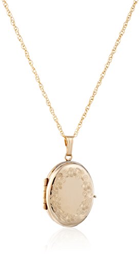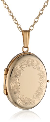 -. Feature : Yellow gold-filled necklace featuring oval locket with engraved flowers around border / Opens to reveal multiple photo windows / Rope chain with lobster-claw clasp / Handcrafted in the USA