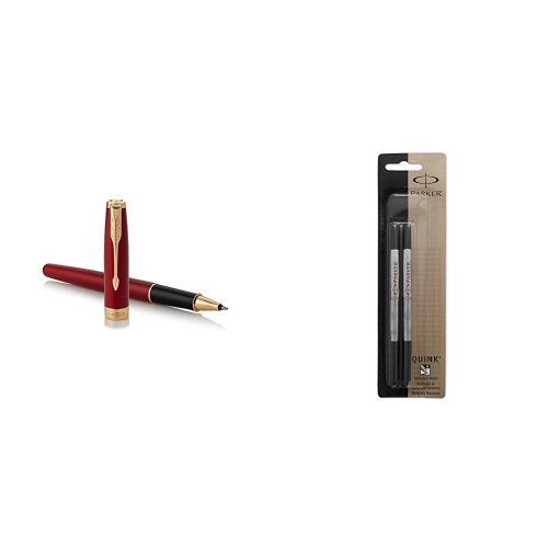 -. Feature : Red lacquer cap and barrel accented by a gold-finished clip and trim / Rollerball design with fine stainless steel tip / Hand assembled and checked for flawless quality / Ink refill designed for PARKER rollerball pens / PARKER QUINK ink offers fluid and reliable writing on paper / Beautifully pigmented ink captures your thoughts