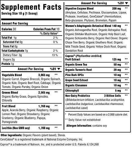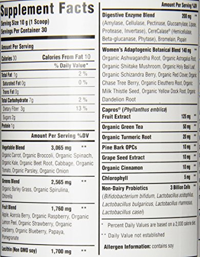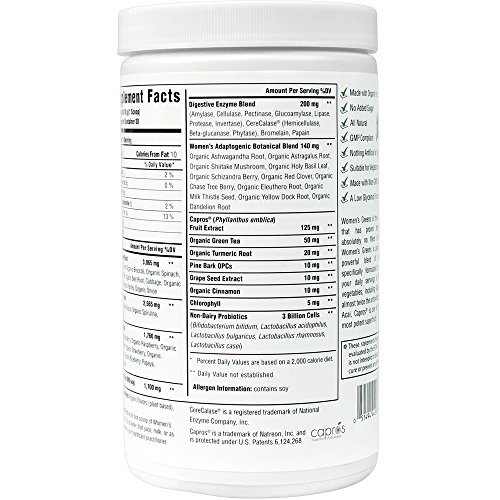 MADE WITH YOU IN MIND: This version of our Renewal Greens blend is made with gender specific herbs shown to be beneficial for women. This organic blend of vegetables, greens, and fruit also contains a complete digestive enzyme and non-dairy probiotic blend to support optimal intestinal health. Also included is an adaptogenic botanical blend to support optimal health for women.