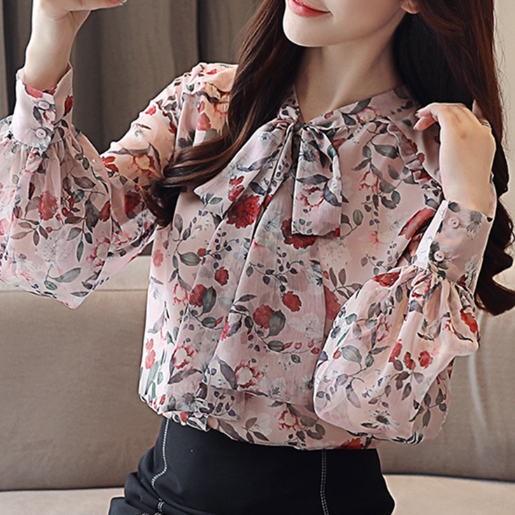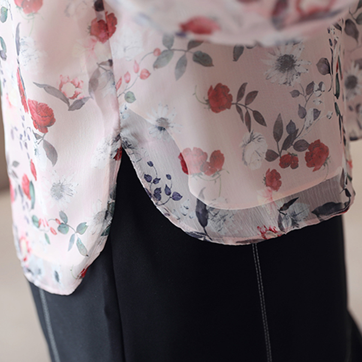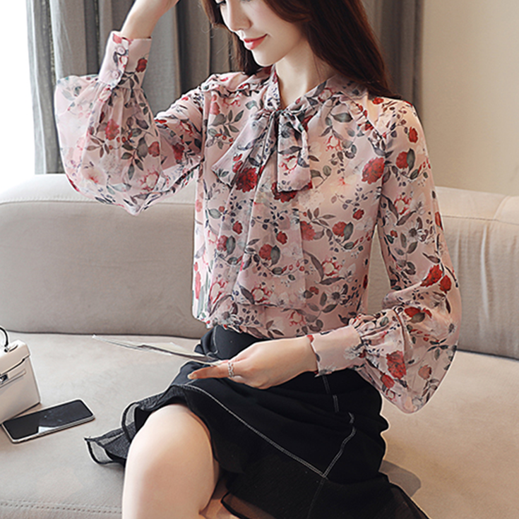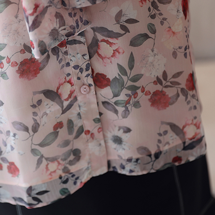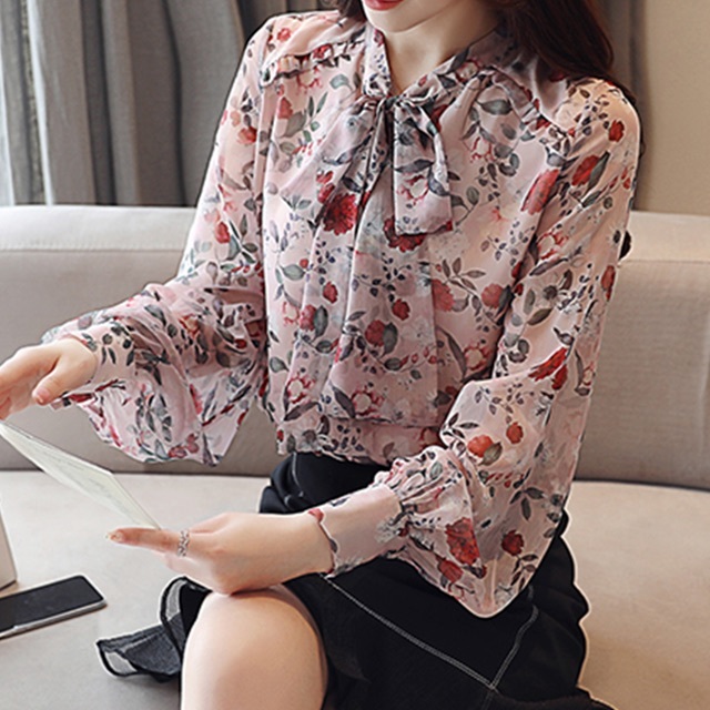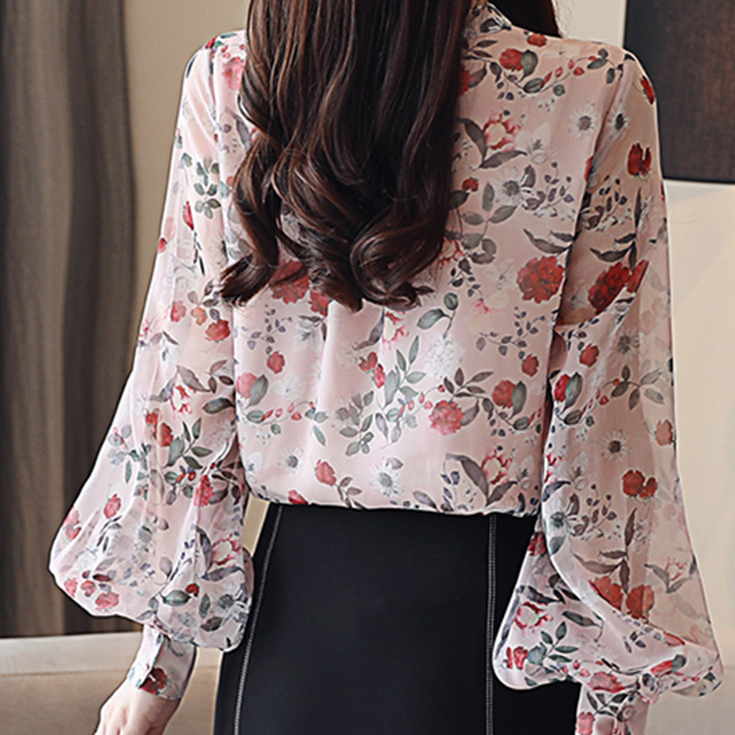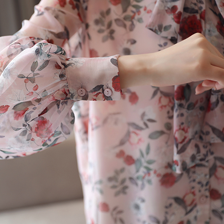 ふんわりとした素材と落ち着いたカラー女性らしく、全体に施された花柄が印象的な長袖シフォンシャツです。