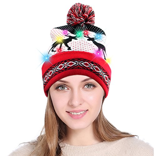 -. Feature : 100% super soft Acrylic, double knitted Christmas Hat, keep your head warm and comfortable / One Size Fits Most Adults & Teens Christmas Stocking beanie Hat / Christmas Reindeer led light up beanie knit hats, perfect Christmas gift for Christmas day / Christmas Light Up Beanie Hat have colorful LED Lights to enhance festival atmosphere, let you become a eye catcher / On/off switch, includes 2pcs CR2032 battery Christmas Pom Beanie LED Light Up Hat