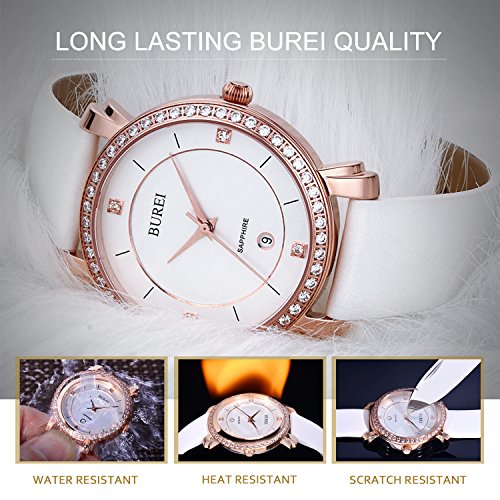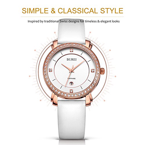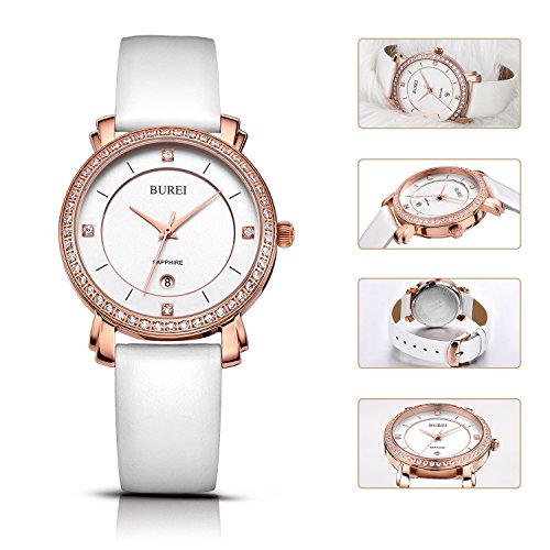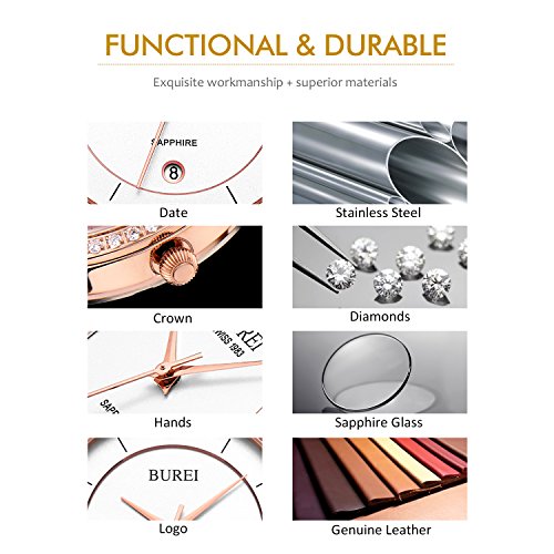 BUREI Women's Classic Rose Gold Wrist Watches Sapphire Lens Alalog Quartz Date Leather Strap