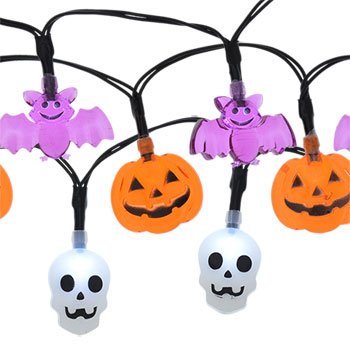 -. Feature : Brighten up your spooky house with these character-shaped Halloween lights. Each set contains one string of each character. / Each character is a 3-ft. strand and contains 10 lights shaped like skulls, pumpkins, or bats for indoor use. / These are great for haunted houses, Halloween parties, and lighting the way for trick-or-treaters. / Each Strand Requires 2 "AA" batteries, not included.