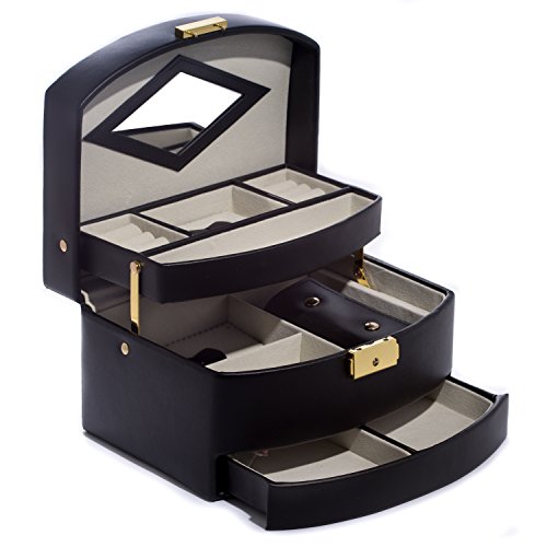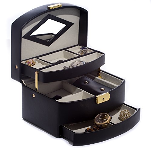 Time Factory AJ-BB522BLK Leather 3 Level Hinged Jewelry Box, Black