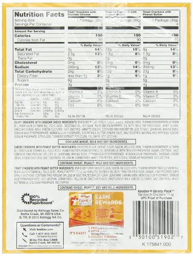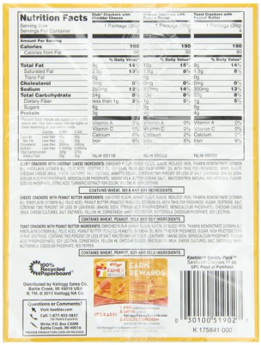-. Feature : Pack of six, 8-count packages of Keebler Sandwich Crackers Variety Pack / Pack includes Toast & Peanut Butter, Cheese & Peanut Butter, and Club & Cheddar Sandwich Crackers / Crackers are conveniently wrapped in single-serving packages of six / Zero trans fats; kosher dairy / Made with real cheese and peanut butter spreads