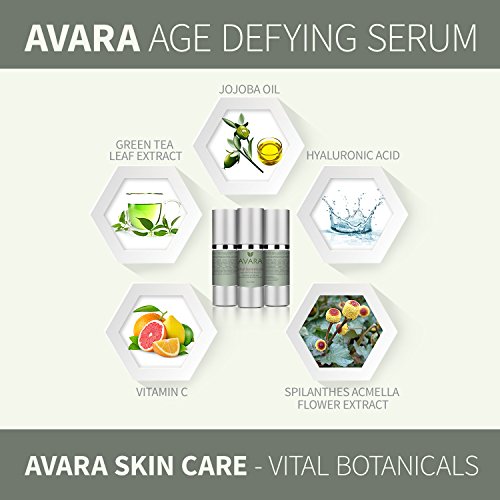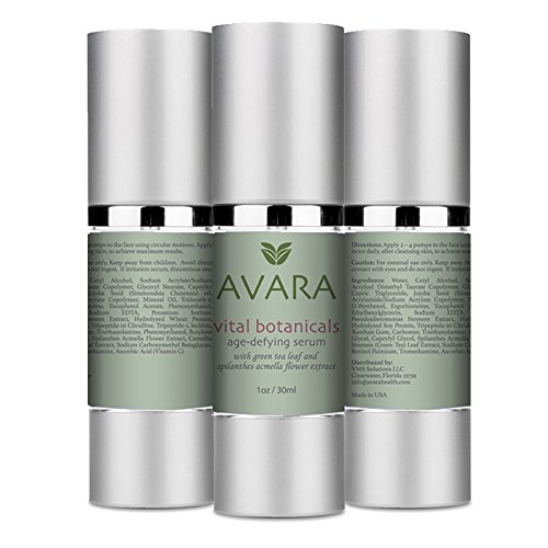 -. Binding : Misc. -. Brand : Avara Skin Care Vital Botanicals -. EAN : 0710882529703 -. Feature : HIGHEST QUALITY INGREDIENTS - Our product is formulated with the highest quality ingredients, including Hyaluronic Acid, Vitamin C, Retinol, Green Tea Leaf Extract, Jojoba Oil and Spilanthes Acmella Flower Extract, to provide you with an immediately effective treatment against the signs of aging. All ingredients are natural, plant-based and made in the USA. / HYALURONIC ACID + VITAMIN C = MOST EFFECTIVE ANTI AGING REGIMENT AVAILABLE - Our age defying serum packs a one, two punch in the form of Hyaluronic Acid and Vitamin C. These essential ingredients naturally hydrate aging skin, protect it from the abundance of damaging free radicals found in our everyday environment, increase collagen production and help to reverse UV related skin damage. / ADDITIONAL BENEFITS - Not only will our age defying serum reduce signs of aging and roughness, it will also tighten the skin's dermal web, lighten sun damage and deliver essential antioxidants to improve overall appearance. The serum is lightweight and comes in a contamination free pump bottle / 100% GUARANTEED - We know you'll love our product and the immediate improvements it brings to your appearance. However, if you are dissatisfied for any reason, please return the product within 90 days for a full refund. Take steps towards a younger you today! Order now and take advantage of our temporary discounted price while stock is still available. Start our treatment today - your skin will thank you! / NATURAL ENHANCEMENTS - Along with receiving the benefits that come with a Hyaluronic Acid / Vitamin C regiment, our customers will also enjoy the advantages of the natural enhancements included in our Vital Botanicals products. Green Tea Leaf Extract, Spilanthes Acmella Flower Extract, and Jojoba Oil promote hydration, reduce inflammation and restore a youthful appearance. Avara Age Defying Serum is ammonia free,never tested on animals,fragrence free, hypoallergenic,all natural ingredients,paba-free, and paraben free -. MPN : 710882529703 -. NumberOfItems : 1 -. PackageQuantity : 1 -. PartNumber : 710882529703 -. ProductGroup : Beauty -. ProductTypeName : BEAUTY -. Title : Avara Age Defying Serum - An All-natural, Plant Based, Skin Tightening Cream - Vitamin C, Green Tea Leaf Extract, Antioxidants, Retinol, Jojoba Oil, Spilanthes Acmella & Vitamin C Skincare -. UPC : 710882529703