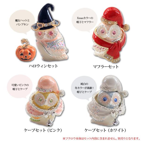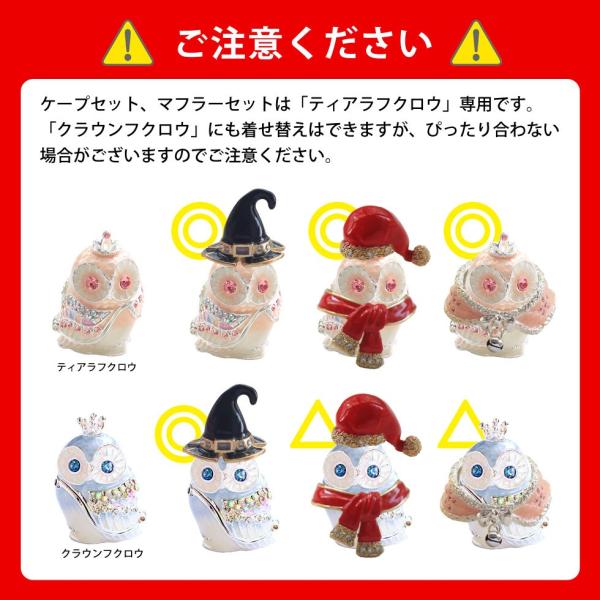 | 着せ替えについて | ※ティアラフクロウ専用の着せ替えセットです。 ※フクロウ本体は別売りです。 ※クラウンフクロウにもお使いいただけますが、ぴったりと合わない場合がございますのでご注意ください。 |
