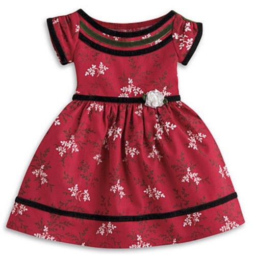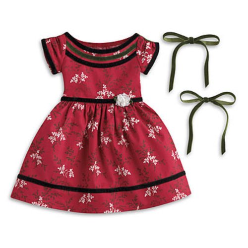 While reciting a poem at the children's benefit, Cécile makes sure she looks her best in this special outfit, featuring: * A beautiful dress, featuring a delicate posy print, a wide neckline with three rows of velveteen ribbon, and a white rosette at the waist * Matching ribbons to sweep back her curls * A pretty pearly necklace offers a finishing touch