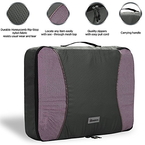 Homdox Packing Cubes One of the toughest things to do while packing for a trip is fitting everything you want to bring with you into your luggage. Our packing cube system fixes that issue by neatly packing all your clothes tightly into our space saving bags. It allows you to easily store and organize your clothing that makes it easy to pack and even easier to unpack. Your clothes will stay more wrinkled free and not get crushed during your travels. We've included a laundry bag with your cube set so that you can separate your dirty clothing from your fresh clothes on your journey back home.
