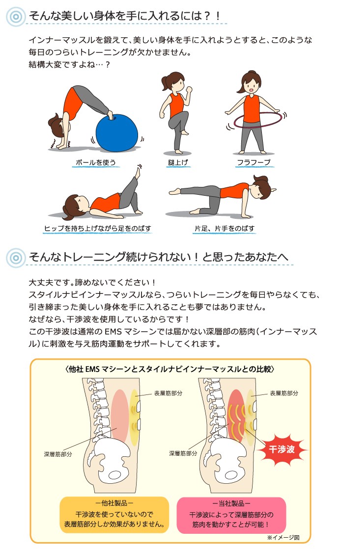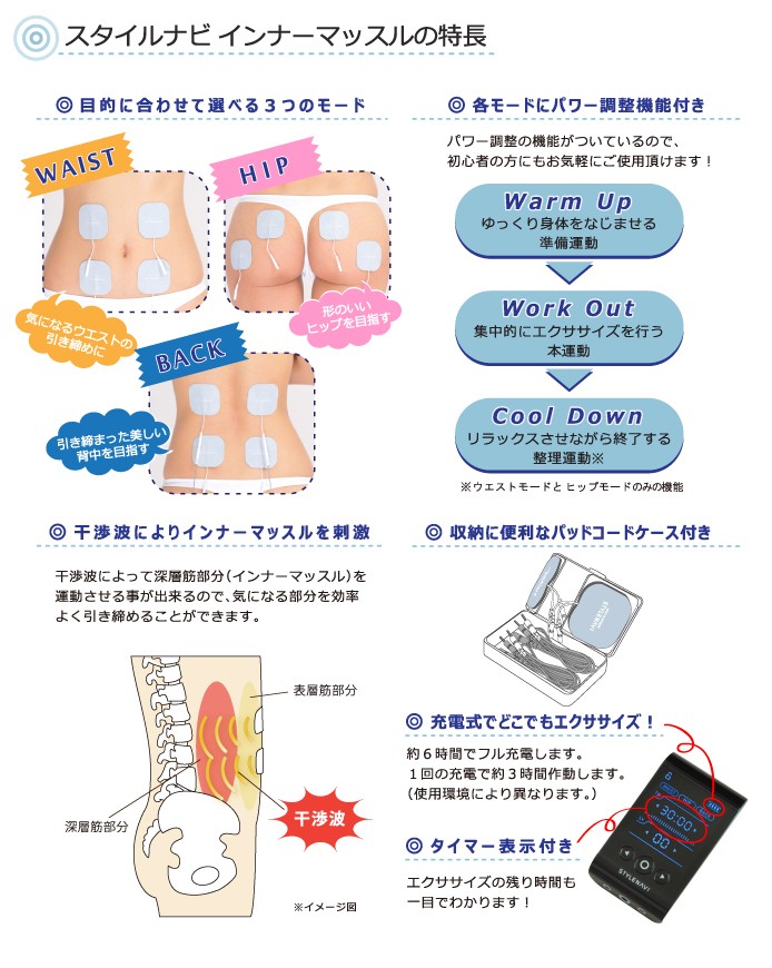 干渉波でインナーマッスルにアプローチ!普通の低周波や中周波では、なかなか届かないインナーマッスル。干渉波であれば深い筋肉までサポート。スタイルナビの系譜を継ぐ高機能で、デザインを一新し、更に効果的で使いやすいモデルが登場。高額機種でしか使用できなかった干渉波のプログラムをお求めやすい価格で実現したEMSフィットネスマシーンです。インナーマッスルにアプローチする干渉波の3つのプログラムで、ウエスト、ヒップ、背中、お腹など内側から筋肉サポート。◎プラソニエ スタイルナビ インナーマッスル◎太もも・腹筋・ヒップにコードレスで使いやすいEMSのダイエットマシン・EMSフィットネスマシン