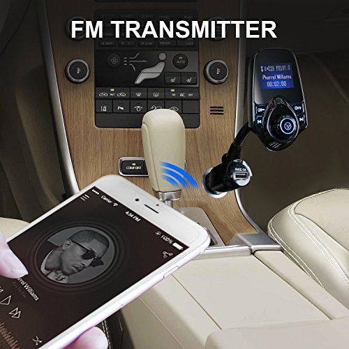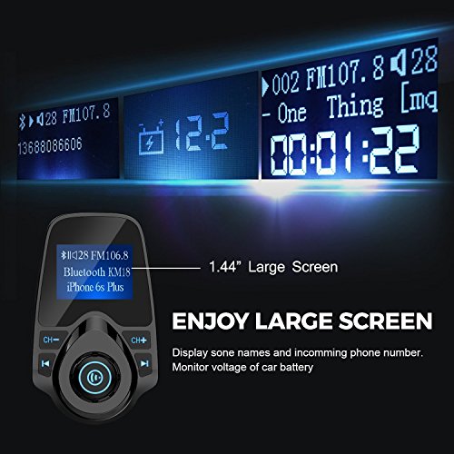 - 【USB Car Charger】Equipped with USB ports, the transmitter can charge your cellphone or tablet, maximum output is 5V/2.1A. 1.44in LCD display screen clearly shows your car voltage when plugged in, phone number for incoming call and song name.