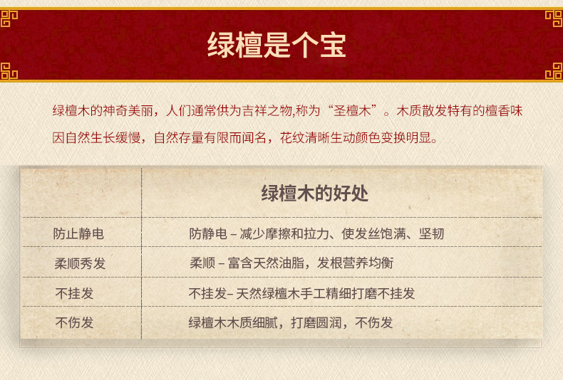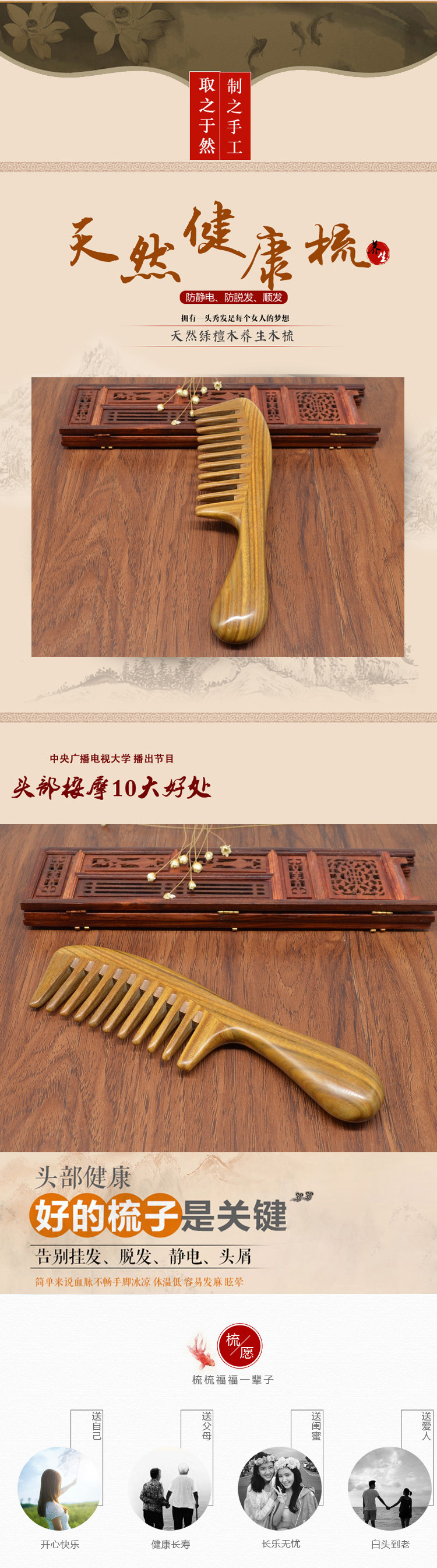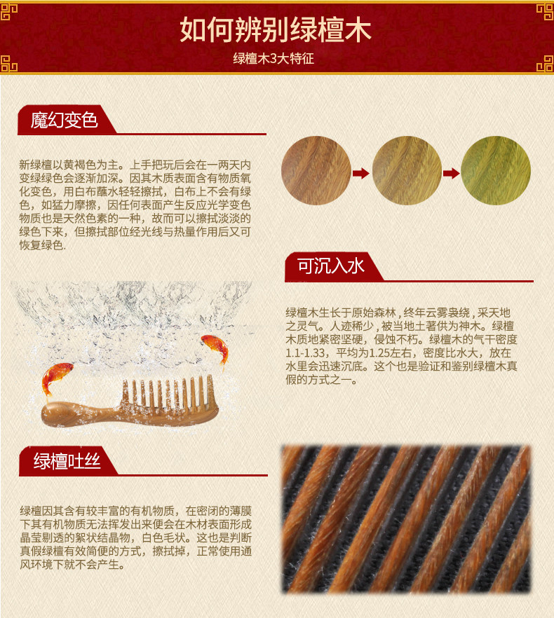 正宗绿檀木,绝对真材实料。木质坚韧,耐腐耐磨,不易变形,具有独特香味绿檀具有天然的耐腐性可抵抗虫蚁 在阳光下呈黄褐色,在光线暗处变成绿色,温度和湿度升高成深蓝色,紫色,这是鉴别绿檀的基本方法梳头时可滋润头发,按摩头部穴位,清热活血保健功效和美容功效,梳头时不起静电。