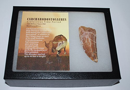 Studio : Fossils, Meteorites, More Publisher : Fossils, Meteorites, More Binding : Toy Product Description This is a tooth from Carcharodontosaurus, otherwise known as "African T-Rex". I guarantee this is a genuine dinosaur tooth. It measures approximately 3.00 inches in length. Included with the fossil is a glass topped display box and nice color information card. This is a great gift idea for a fossil lover! Carcharodontosaurus was from the Cretaceous period, about 100 million years ago! This tooth was found S. of Taouz, in the Moroccan Sahara. Possibly larger than T-Rex, this dinosaur had large serrated "steak-knife" teeth superbly adapted to cutting and rending flesh. Coupled with strong muscular neck and rear legs, this dinosaur was a fearsome predator. We have a variety of other Carcharodontosaurus teeth in various sizes and qualities so be sure to check out our other items! 0