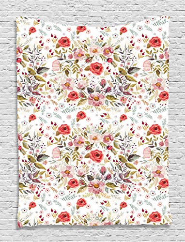 Flower Tapestry Romantic Decor by Ambesonne, Romantic Floral Roses and Flowers Bud Leaves Style Spring Design, Bedroom Living Room Dorm Wall Hanging Tapestry, 60 X 80 Inches, Pink Red Grey Green