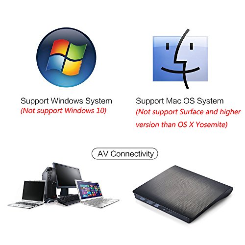 Compatibility: WindowsXP/2003/Win8/Vista 7, Linux, Mac 10 OS system, NOT compatible with higher version than OS X Yosemite. Speed: DVD+R=8X DVD-R=8X DVD+RW=8X DVD-RW=6X DVD+R9 Dual Layer=6X DVD-R9 Dual Layer=6X DVD-RAM=5X CD-R=24X CD-RW=24X