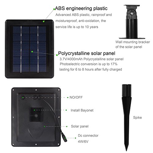 - 4W/6V SOLAR PANEL, 4000 mAh LITHIUM-ION RECHARGEABLE REPLACEABLE BATTERY:good enough to provide an average of 8-10 hours continuous illumination time with full charge for dust to dawn