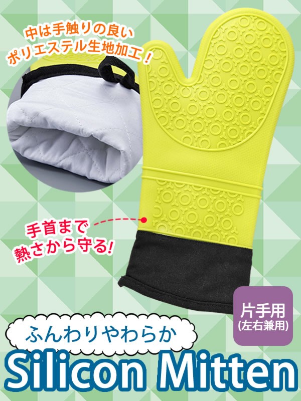 | <h1>シリコンの中に手触りのいい生地を加工したミトンです。シリコンなのにごわつきがなく、しっかり掴めます。長さがあるので手首まで熱さからしっかり守ります。吊り下げフック用の穴付きで収納に便利!</h1> |