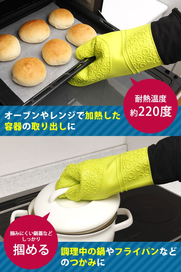 | シリコンの中に手触りのいい生地を加工したミトンです。シリコンなのにごわつきがなく、しっかり掴めます。長さがあるので手首まで熱さからしっかり守ります。吊り下げフック用の穴付きで収納に便利! |