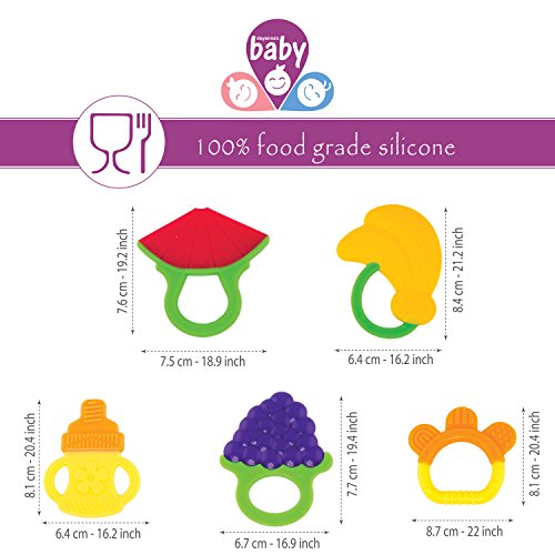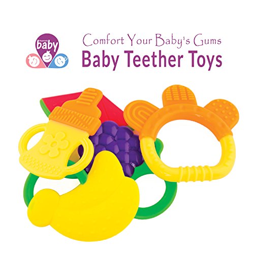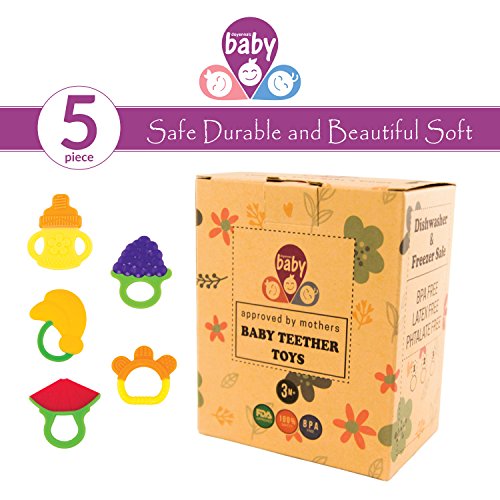 -. Binding : Toy -. Brand : Doyenna's Baby -. Color : Black -. Department : unisex-child -. EAN : 3757157639139 -. Feature : 100% SAFE FOR YOUR CHILD-As mothers, we understand just how fragile your baby's health is, that's why we take no chances on safety.Doyenna's Baby Teething Toys are made of are FDA approved and 100% safe for your infant! Each of our fully FDA compliant teethers are made with 100% food grade silicone that is odourless, BPA Free, non-toxic as well as phthalate, lead, latex, artificial colors, gels, and chemical softener free.This offers amazing value and is perfect for your baby or as a gift / SOFT and SOOTH -The soft silicone baby fruit teethers toys have the grooves and bumps to gently rub a baby's gums without harming the child's mouth area. Another thing, since their hands do not quite have good motion control yet, the soft infant teething toys do not hurt them when putting it close to their face. / UNIQUE DESIGN - It is designed as a fruit teether tree. The handle is just right for baby to hold and the size is good for them to chew. Baby loves the bright colors and the fruity shapes. It's great way to keep them busy and entertained, at the same time have some relief for their teething. / FUN COLORFUL FRUIT SHAPES will appeal to boys and girls and keep your baby more comfortable and less irritable throughout the teething process. These baby teething toys are durable enough to last well beyond the teething phase of your baby's growth and will develop the essential touch and feel senses that are vital for baby spatial development. The easy to grab handles are also perfect for tiny mouths and will entertain and keep your baby busy and calm / FULL REFUND- We are so confident that you will love the Doyenna's Baby Fruit Teether Set that we are happy to offer you a full refund if you are not 100% satisfied. A totally risk-free buy - order now -. IsAdultProduct : 0 -. Label : DongGuan Hugebirds -. Manufacturer : DongGuan Hugebirds -. PackageQuantity : 5 -. ProductGroup : Toy -. ProductTypeName : TOYS_AND_GAMES -. Publisher : DongGuan Hugebirds -. Size : Small -. Studio : DongGuan Hugebirds -. Title : Silicone Fruit Baby Teether Set (5 Pack) for Baby Massage Soothe Molar Teeth Soft Silicone BPA Free
