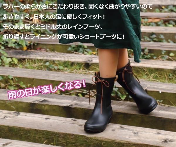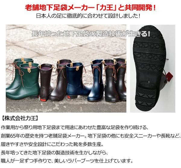 日本の老舗地下足袋メーカー「力王」の協力を得て、人間工学的な観点から開発されたレインブーツです。ラバーの柔らかさにこだわり抜き、固くなく曲がりやすいので歩きやすく、日本人の足に優しくフィット!そのまま履くとミドル丈のレインブーツ、上部を折り返すとライニングが可愛いショートブーツとしてもお使いいただけます。 |