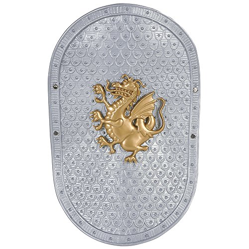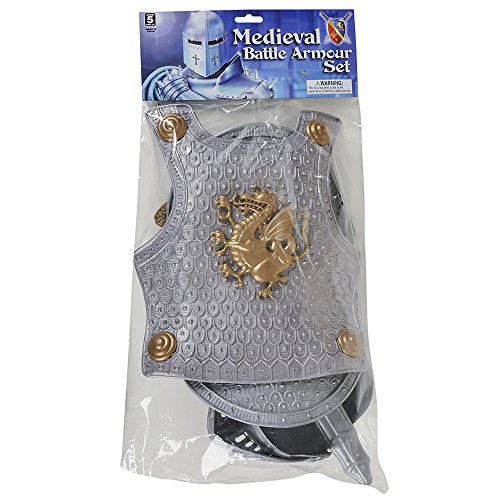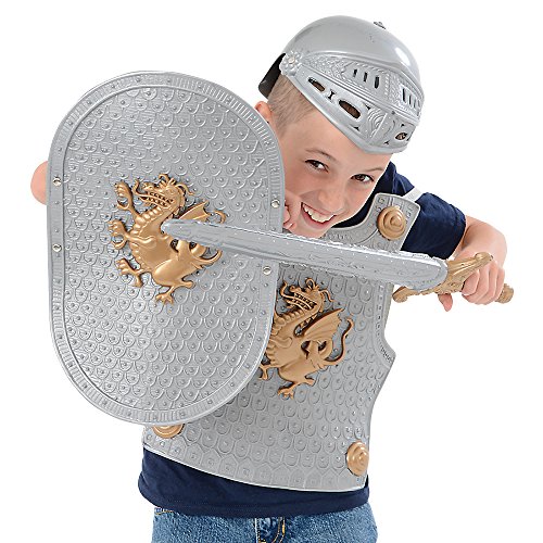 Set includes breast plate, helmet, sword and shield.
