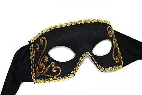 A tie-on black Verona mask is edged with gold braid and hand-painted with glittery swirls.