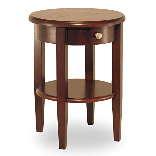 -. Brand : Winsome -. Color : Brown -. Feature : Wood veneers in antique walnut finish / 1 drawer with brass-finished drawer pull / Full-sized lower shelf adds stability and storage space / Stylish round end table - fine alternative to square / Dimensions: 17.5W x 17.5D x 22.5H inches -. ProductGroup : Furniture -. ProductTypeName : HOME_FURNITURE_AND_DECOR -. Title : Sturdy Winsome Kaden End Table