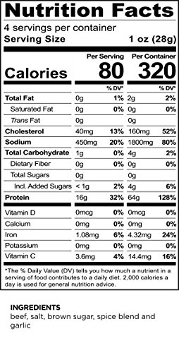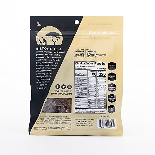 -. Feature : ADDICTINGLY FLAVORFUL: Stryve Biltong is dry rubbed with simple ingredients and cured for 21 days allowing each batch to be consistently tender. / 16 GRAMS OF PROTEIN PER SERVING: Whether you're looking to reduce hunger, gain muscle mass, or boost your metabolism, a high protein diet will help you reach your goals! / THE HEALTHIEST SNACK ON EARTH: This wholesome and nutritious snack is high in protein with only one gram of carbs, less than one gram of sugar and zero grams of fat! / CONTROL YOUR CRAVINGS: Curb those hunger pangs with a protein-packed snack and feel confident with every delectable bite. / THE PERFECT GRAB 'N GO SNACK: Our conveniently packaged biltong is perfect for the whole family. Simply toss a bag in your lunch box, briefcase, or purse and Stryve on with your day.