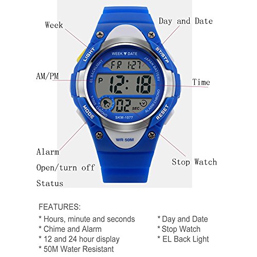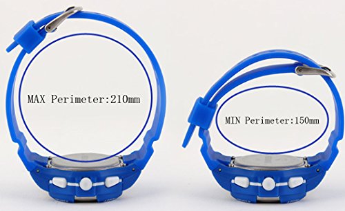 -. Feature : 3 Color Listing to Choice : Blue ,Black,Rose Red / High quality movement and rubber band / Alarm clock, timer, back lighting, calendar, 12H/24H time function, 4 seconds EL backlight,50-day automatic memory storage step function,up to 23hr.59min / 5ATM Water Resistant for Swimming (Note: Do not Operate The Buttons When The Watch in Water)