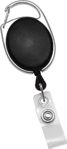 - Carabiner-style badge reel with chrome outer frame and clear vinyl strap.