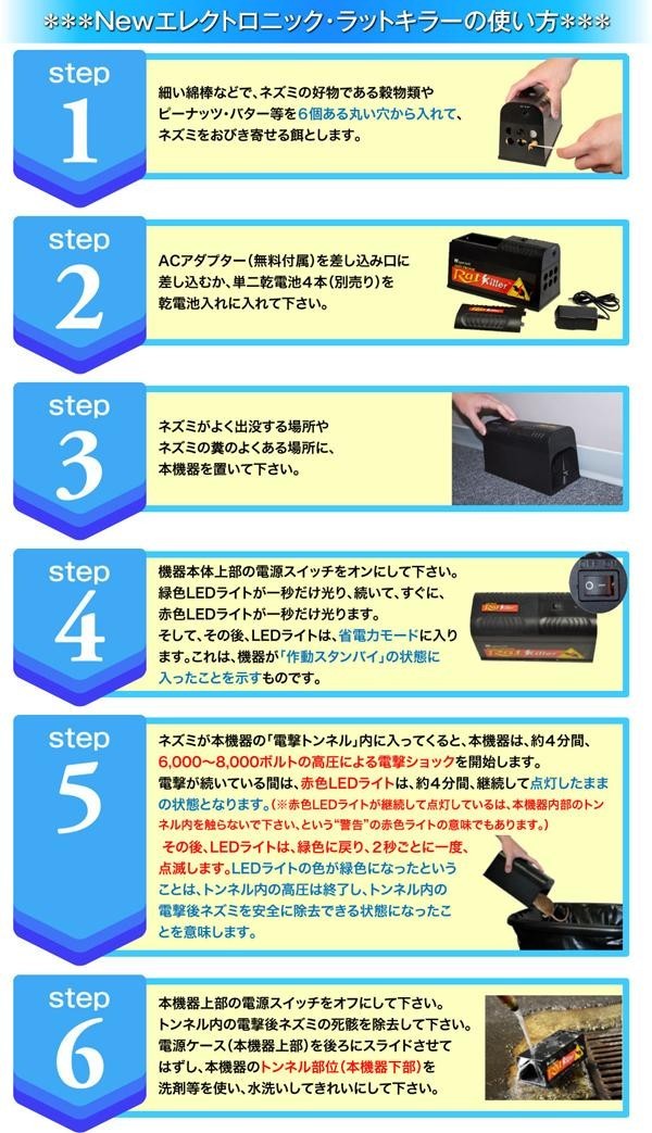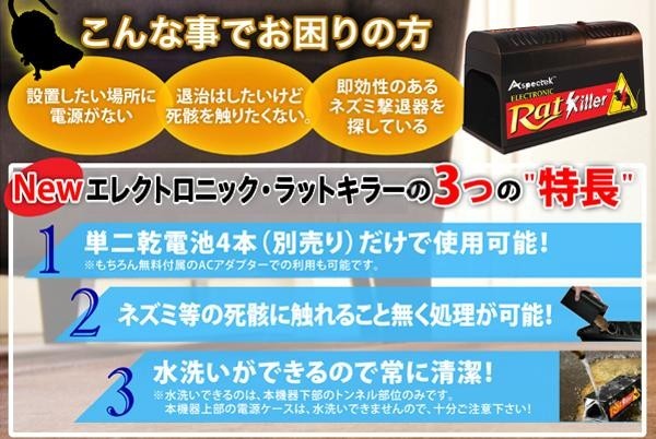 | ●正規輸入品だから、プラグピン・電圧など日本仕様で安心です!! | | ●ねずみに触れることなく、約8000ボルトの電撃でやっつけ、処理できます!! | | ●水洗いができるから清潔に使えます!!(本体下部のトンネルのみ) |
