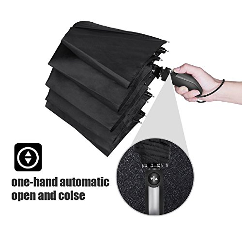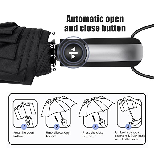 -. Feature : Automatic Operation: Quickly open and close the canopy with the push of a button.When you get caught in an unexpected downpour, you won't look like wet dog by opening the umbrella in less than a second.Easy and simple to use with just one hand.You can experience open/close the umbrella in no time when you have your hands full. / Superior Waterproof:EletecPro travel umbrella can protect you even if in a drenching downpour with a premium quality canopy which is made from 300T pongee that is highly water repellent and quick drying.The drops will flip away when the rain falls. It only needs you to shake gently after closing the umbrella, then all the drops will gone.So the fabric won't easily soaked. / Compact and Convenient to Carry: With a 46-inch canopy, 13-inch close length and weight of only 14.99 oz, EletecPro folding umbrellas designed to fit in briefcases, backpacks, travel totes, and the glove compartment of your car. This also comes with a handy storage sleeve. With its sleek all black design and heavy duty construction, EletecPro compact umbrella is the perfect companion for the frequent traveller. / High Quality Material: This travel umbrella's outside surface is made of highly absorbent pongee fabric, and the frame are a combination of electroplated steel shaft and premium resin-reinforced fiberglass ribs which ensure our windproof umbrellas tough enough to endure 80 MPH gusts.The rubberized ergonomic handle with finger-notches provide better grip feeling and reduce wrist fatigue. / Lifetime Warranty: If it doesn't meet your expectations, just contact us and we offer a full refund for the first 90 days or a replacement warranty for the lifetime of your purchase!