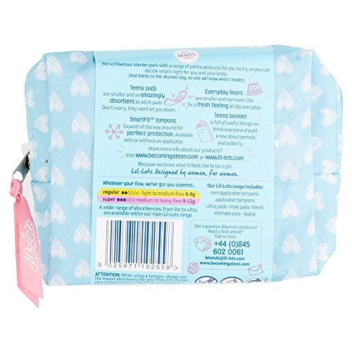 Studio : Lil-lets Publisher : Lil-lets Binding : Health and Beauty Product Description Lil-Lets teens starter pack includes a range of product for you to try and decide what's right for you... and with the pretty and discreet bag no one will know what's inside. Lil-Lets teens towels are smaller and just as absorbent as adult towels, so they won't let you down Everyday freshness liners designed smaller and narrower, especially for girls Tampons gently expand sideways for complete protection, and are available with or without an applicator Our little booklet is full of useful things every girls should know about puberty and periods 0