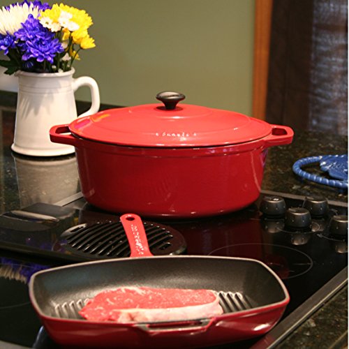 • Cast iron lets you keep the heat low while distributing even heat for ideal cooking.