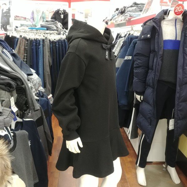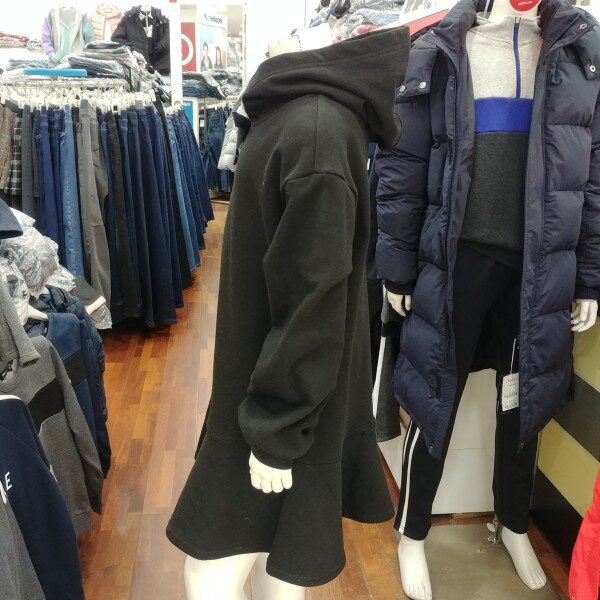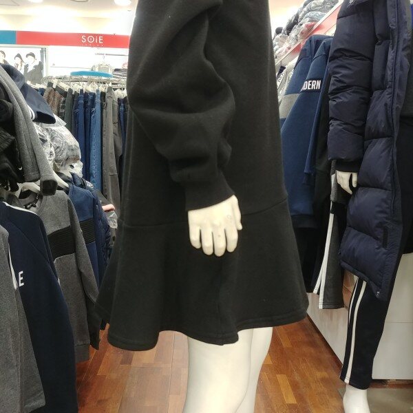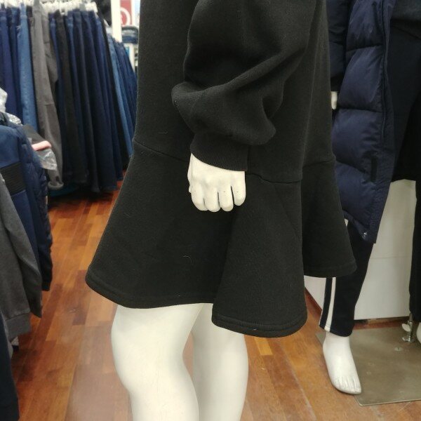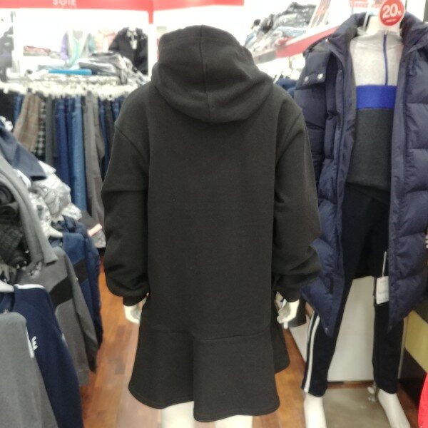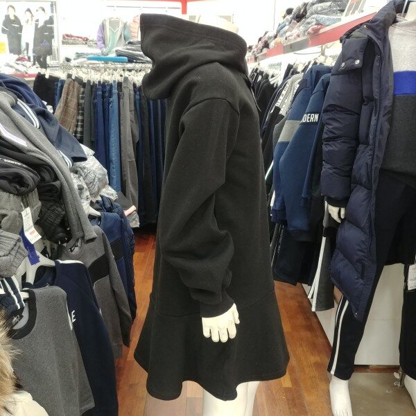 후드 원피스입니다.기모가 깔려 있는 겨울 원피스 입니다.단순하지만 그 단순함이 돋보이는 디자인 입니다.소매 부분의 나팔꽃 같은 디자인이 이쁩니다.