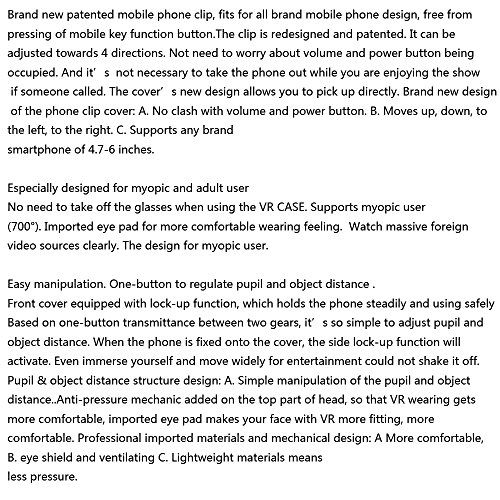 -. Binding : Electronics -. Brand : YORKING -. Feature : Ultra-clear 130°wide visual angle, pure glass coated lens (Not usual resin lens with low light transmittance) / Similarly all-in-one control system, brand new portable combination remote control design / Brand new patented mobile phone clip, fits for all brand mobile phone design, free from pressing of mobile key function button / Especially designed for myopic and adult user / Easy manipulation. One-button to regulate pupil and object distance . Front cover equipped with lock-up function, which holds the phone steadily and using safely. The design of professional head-mounted and imported eye pad, provide more comfortable after prolonged viewing -. Label : YORKING -. Manufacturer : YORKING -. MPN : KING000081-01 -. PackageQuantity : 1 -. PartNumber : KING000081-01 -. ProductGroup : Speakers -. ProductTypeName : CE_ACCESSORY -. Publisher : YORKING -. Studio : YORKING -. Title : YORKING Ultra Clear All-in-One VR CASE BOX 6th Generation 3D Glasses Virtual Reality Google Cardboard Headset + The Third Generation Bluetooth Remote Controller
