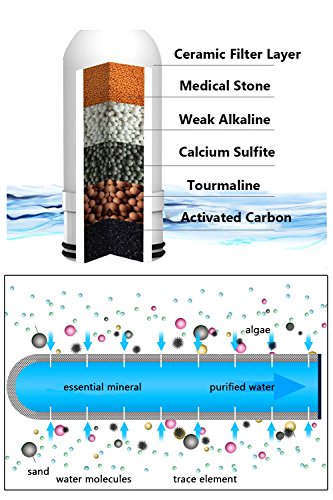 - Strong intelligent 6 stage filter:Ceramic Filter Layer+ Medical Stone+ Weak Alkaline+ Calcium Sulfite+ Tourmaline+ Activated Carbon,remove up to 99% of contaminants including arsenic, chlorine, lead, fluoride, heavy metals, bacteria, virus , odor, mercury