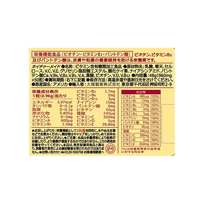 영양 성분 : 1알(0.96g)당첨되어 에너지/3.98kcal,단백질/0?0.1g,지질/0?0.1g,탄수화물/0.806g,나트륨/0?2mg,비타민A/600μg,비타민B1/1.5mg,비타민B2/1.7mg,비타민B6/2mg,비타민B12/3μg,나이아신/15mg,판토텐산/6mg,엽산/200μg,《비오친》/30μg,비타민C/300mg,비타민D /5μg,비타민E/26.8mg