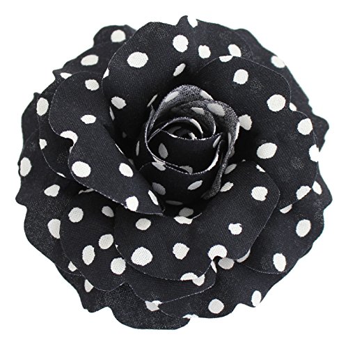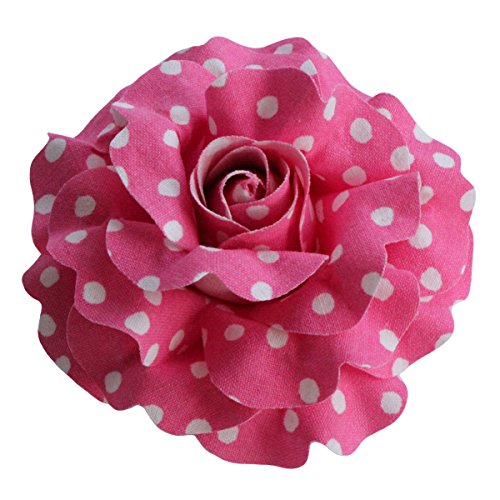 The Polka Rot Roses are entirely handmade in the USA. Approximately 3.75 inches (9.5cm) in diameter and 2 inches tall. Versatile dual alligator hair clip & brooch pin backing with a reverse back petal to hide the clip. The fabric was purchased from a fabric store in NJ. The fabric stiffener used to pre-treat the fabric is made from the ingredients of an American manufacturer. The die to cut the petals was custom made by a die maker in St Paul, MN. The vintage bronze mold used to shape the petals was hand designed and hand cast around the late 1800's or early 1900's by American flower tool artisans in NYC. And the final flower was designed and handmade in the studio of Sara Monica Flower Crafts, Dunellen NJ.Feature
