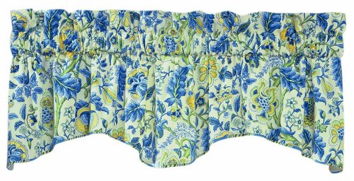 Waverly floral window curtains make any home more warm and beautiful. This 50-inch W by 15-inch L scallop window valance features a Jacobean pattern of soft neutral florals accented with hints of sage and crimson. Embellished fancy gimp trim adds extra flair. Perfect for kitchen, bedroom, living room or bath.Feature